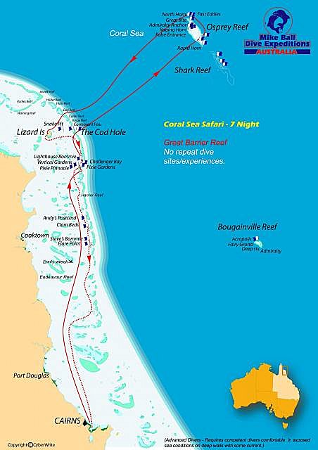 The new 7 night, 450 mile Coral Sea Safari includes some of the best dive sites on Australia’s Great Barrier Reef and Coral Sea featuring: spectacular first dive at Challenger Bay, diver size fish at the Cod Hole, plummeting Coral Sea wall dives in gin clear water, exciting shark action in the Coral Sea, schooling trevally and barracuda in the Coral Sea, exploration of Lizard Island, the Cod Wall, outer edge big fish dive, the prime Ribbon Reef sites, all dives north of Cooktown, dive site guarantee!