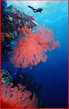 Friday & Saturday: Two days will be spent diving Osprey Reef (weather permitting). Australia's Coral Sea reefs are renown for crystal clear water with visibility ranging 30 to 100 metres. The landscape is amazing with sheer walls laced with gorgonians, sea whips, and bright yellow soft corals, rising from the ocean floor thousands of feet below. 'North Horn' is a dive site at the tip of Osprey where grey reef sharks, silvertips, and the occasional oceanic congregate, and you can experience a close encounter with the Spirit of Freedom shark attraction dive. 4 to 5 dives will be available each day, including a night dive on the Friday. See the dive site page for site selection of some of our dive sites at Osprey Reef. On Saturday night we will depart Osprey Reef for overnight travel to the Ribbon Reefs.