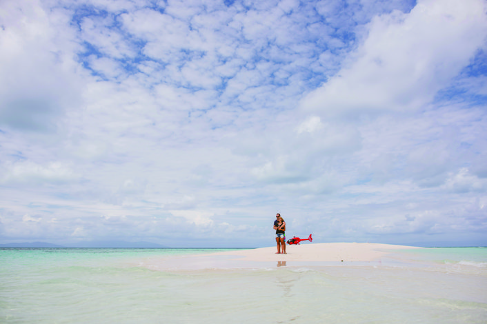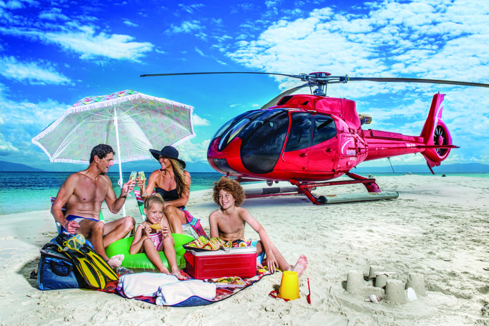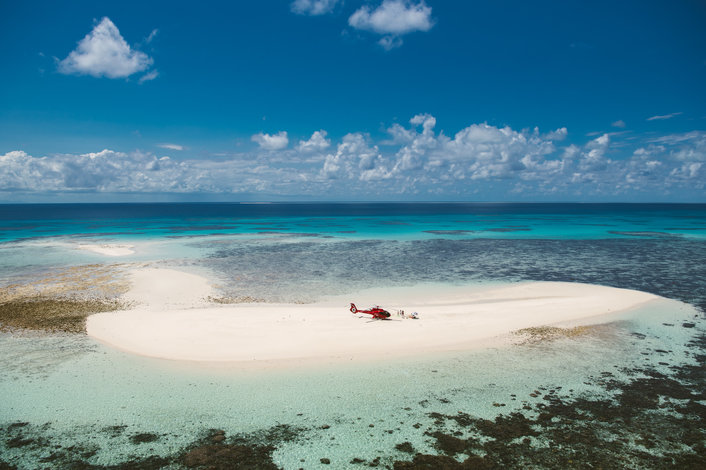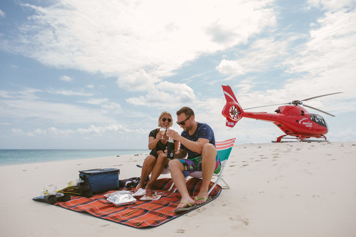 - Scenic helicopter flight both ways to sand cay, picnic, sparkling wine, snorkelling equipment, umbrella and chairs.