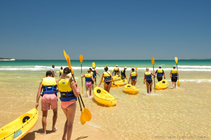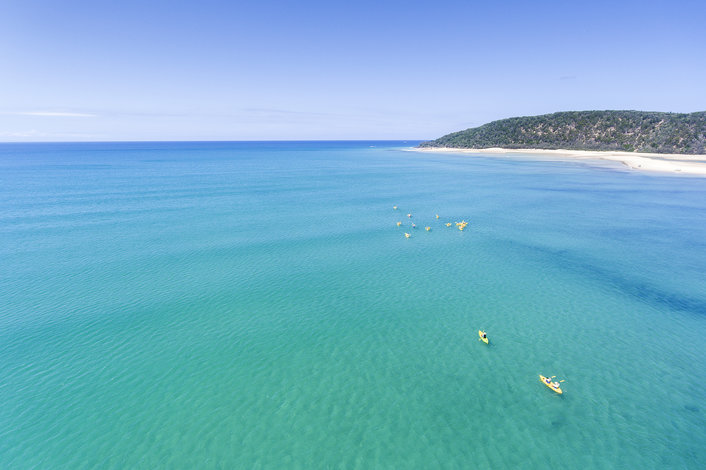 Experience an Epic Ocean Adventure back to nature and into the wild with our Dolphin View Kayak Tour. It all starts with a stunning beach 4X4 trip into the Great Sandy National Park to the spectacular Double Island Point. Take in the views and natural beauty of Australia’s Nature Coast on a guided ocean kayak paddle whilst experiencing the buzzing hub of wildlife in this tropical aquatic paradise. This location features scenic views of the Rainbow Beach coloured sands, Fraser Island and pristine Honeymoon Bay.