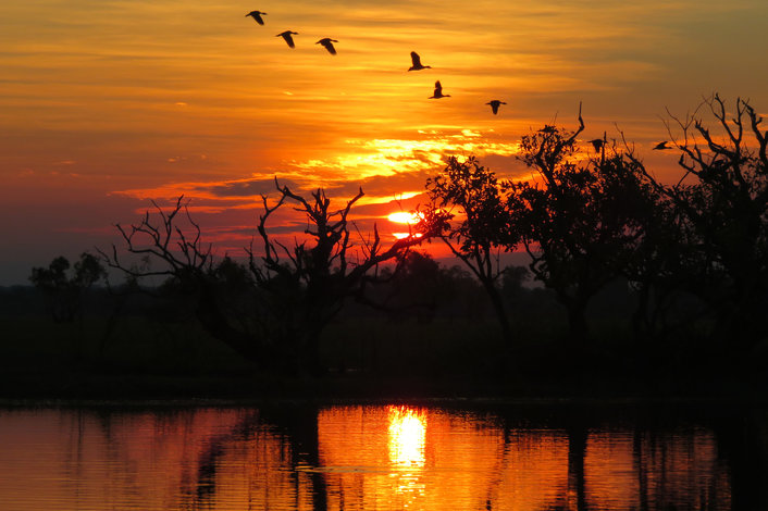 Late afternoon is generally the best time of day to see animals and our 2.0 hour sunset cruise allows you to view the wildlife during their very active periods. Birds are trying to catch their final meals before flying to roost for the evening and crocodiles are on the move ready for a night of hunting. Add to this a spectacular sunset over the floodplains and it`s easy to understand why this is one of our most popular cruises.